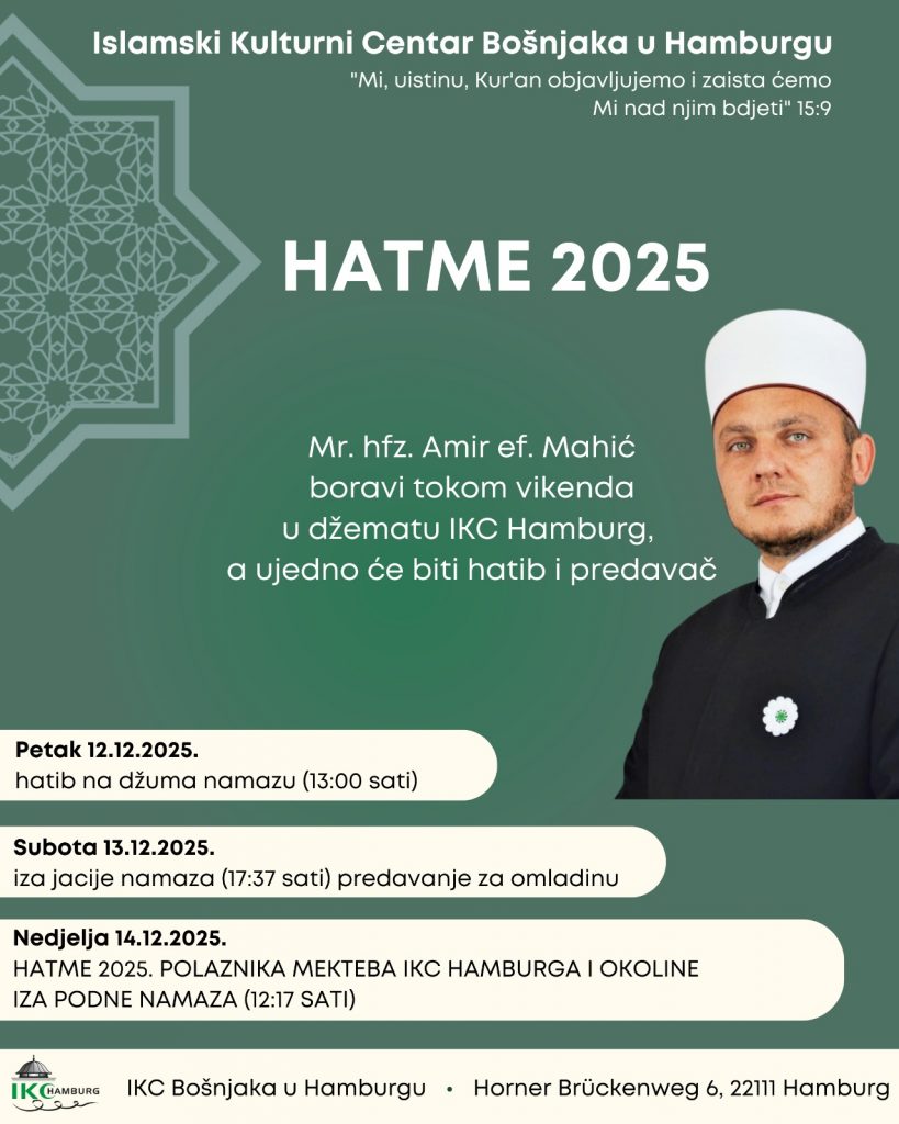 Obavještavamo vas da ćemo dana 14.12.2025 (nedjelja), iza podne namaza (12:20 sati) imati veliku manifestaciju povodom završetka Hatmi u našem džematu.