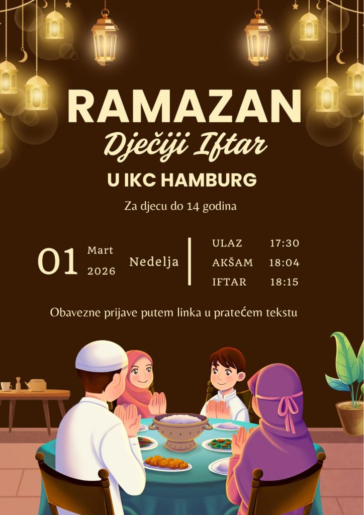 Mjesec Ramazan donosi posebnu priliku za zajedništvo, druženje i jačanje naših veza. Stoga vas pozivamo na DJEČIJI IFTAR u IKC Hamburg, koji će se održati u nedjelju, 01.03.2026. godine.