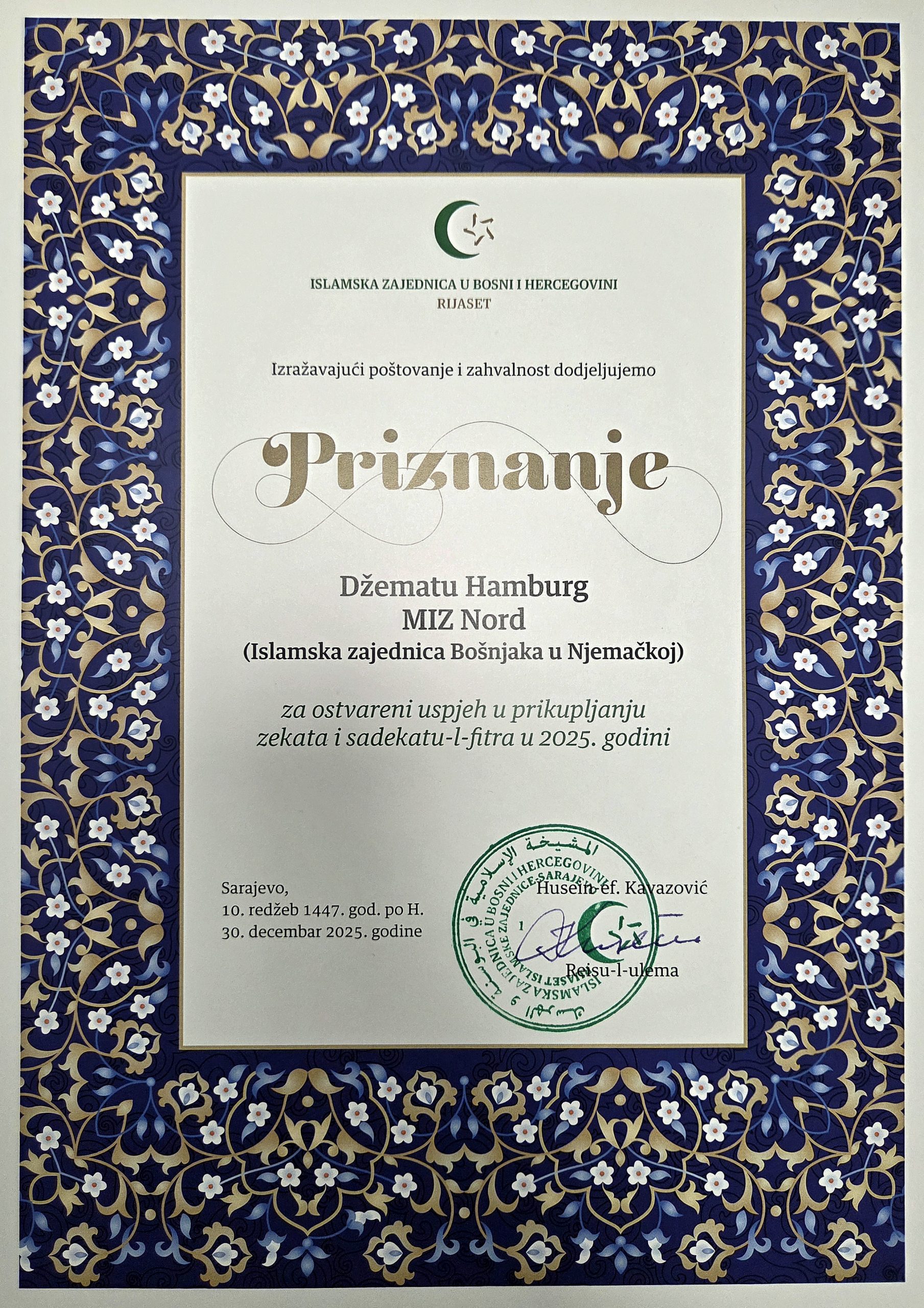 Der Džemat Hamburg hat von der Islamischen Gemeinschaft eine Auszeichnung für die erfolgreiche Sammlung von Zekat und Sadekatu-l-fitr im Jahr 2025 erhalten.